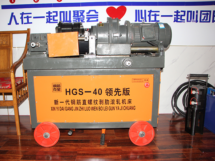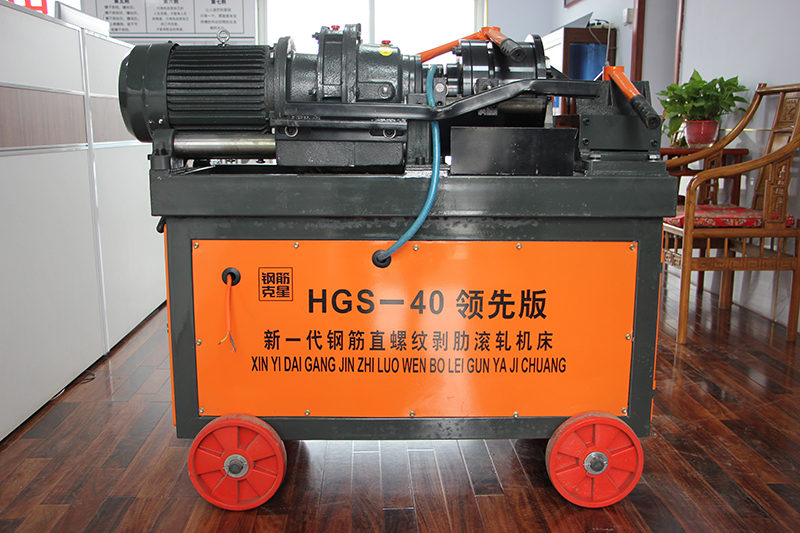 HGS-40型鋼筋直螺紋滾絲機:由機架、夾緊鉗、導軌、滑套、擺線針輪減速機、剝肋滾軋頭、進給機構、自動開合機構、行程限位機構、冷卻系統、電器控制箱、控制系統等部分組成。